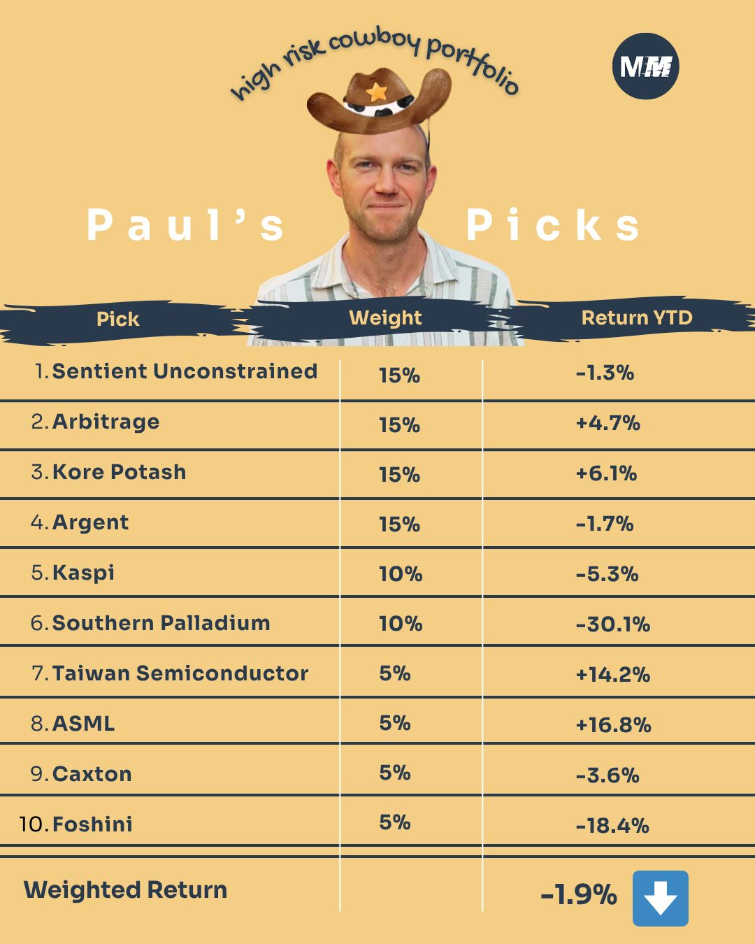 These reflect the core portfolios we manage for clients via Allan Gray. They show how each mandate (from Conservative to Unconstrained) is positioned and how it has performed.Paul’s Personal (High-Risk) Portfolio